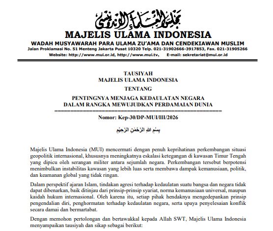 MUI – Majelis Ulama Indonesia (MUI) mencermati dengan penuh keprihatinan perkembangan situasi geopolitik internasional, khususnya meningkatnya eskalasi ketegangan di kawasan Timur Tengah yang dipicu oleh serangan militer antara sejumlah negara. Perkembangan tersebut berpotensi menimbulkan instabilitas kawasan yang lebih luas serta membawa dampak kemanusiaan, politik, dan keamanan global yang tidak ringan.